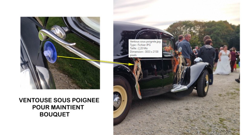 Par ailleurs, régulièrement, la ventouse pour voiture de mariage se retrouve sur le capot. En conséquence de quoi, le chauffeur doit faire plus attention dans la conduite de l’auto. Certains bouquets masquent une bonne partie du petit pare-brise de la 2cv ou de la Traction.