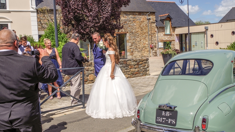Il faut plus d’une demi heure avant que le cortège sorte de l’hôtel de ville. Emma Emma comme chante Jeanne Moreau arrive au bras de Junior devant la grande porte de l’édifice religieux, deuxième partie du processus de mariage. La séance photo est prévu au monastère de Plerguer. En fait il fallait comprendre dans un champ avec le monument historique en arrière plan. Un dernier petit tour vers la salle des fêtes et je m’en retourne sur Dinan: le dos a tenu.
