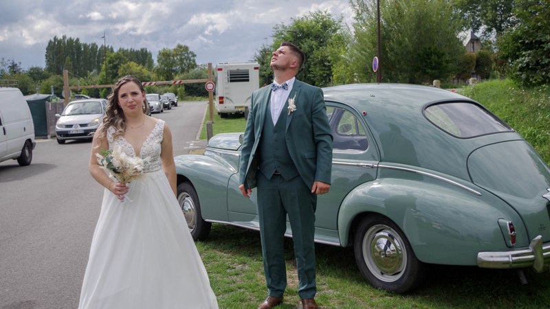La voiture de collection mariage 35 passe devant le domicile d’Alexandra et Quentin; ils ne sont plus là! L’effet inertie et retard n’aura pas eu lieu. J’arrête la 203 à côté de l’église. Les futurs mariés et les invités attendent l’invitation à passer la grande porte en bois. On vient me voir et me félicite sur l’état de vieille Peugeot. Çà c’est joué à pas grand-chose.