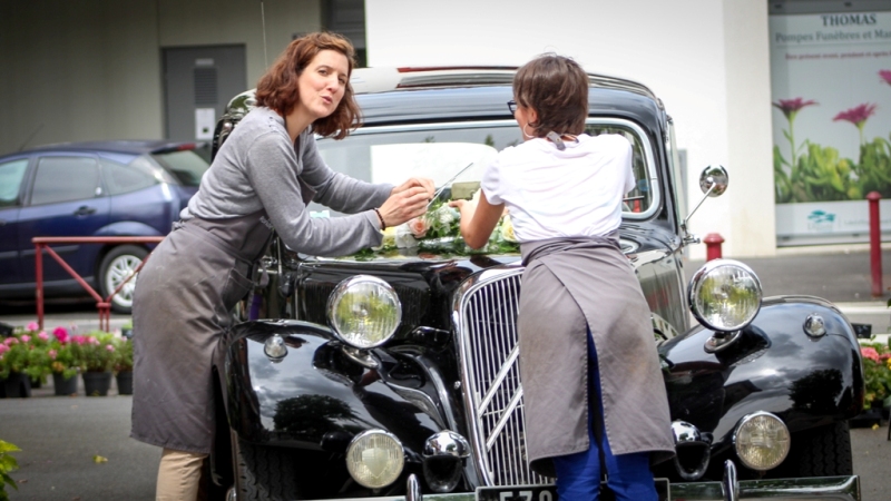 Dans le but de de ne pas arriver le matin, je négocie la décoration de la Traction Citroën en début d’après-midi. Noémie de art et fleurs vient de Plouer sur Rance et décore la salle vers midi. De ce fait, elle s’occupera de la voiture dans la foulée. Comme il est quatorze heures et que la cérémonie à quinze heures quarante cinq, il faut attendre.